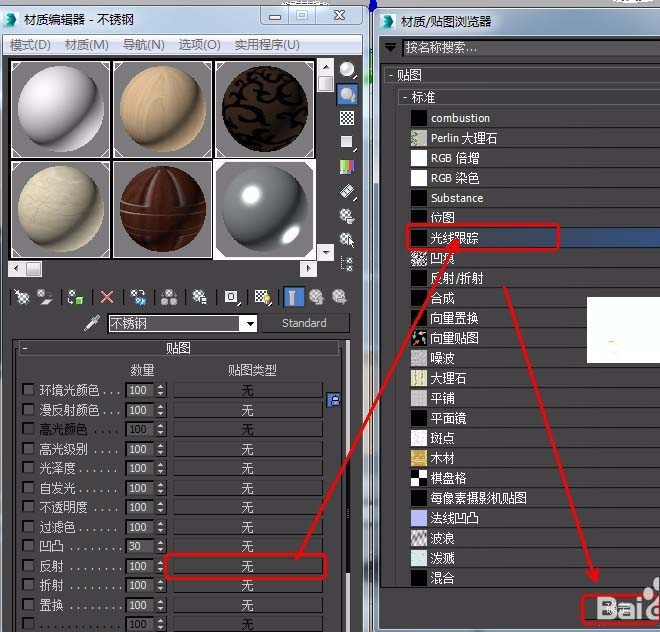 3、進入“貼圖”層級,選擇“反射”后的“無”按鈕,在打開的“材質/貼圖瀏覽器”窗口中選擇“光線跟蹤”,單擊“確定”按鈕,3DsMax2015中文版如圖所示。