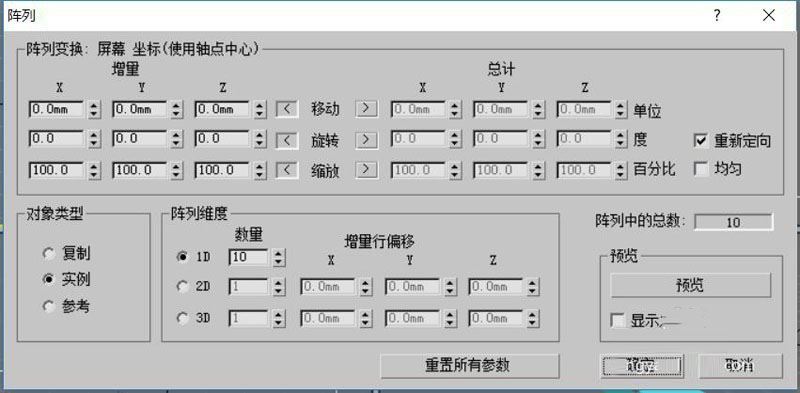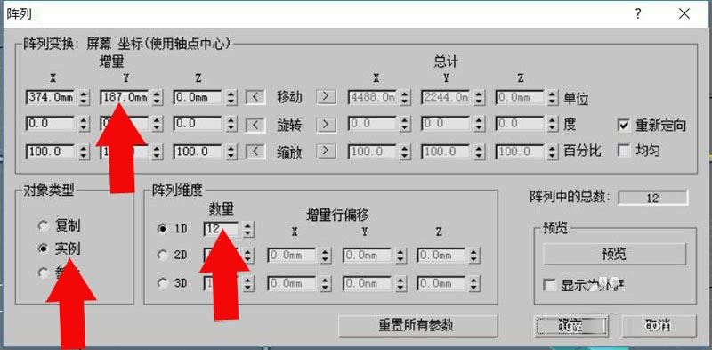 3、在增量里y軸填矩形的高度,x軸填矩形的寬度,對象類型選擇實例,數量填12。確定。