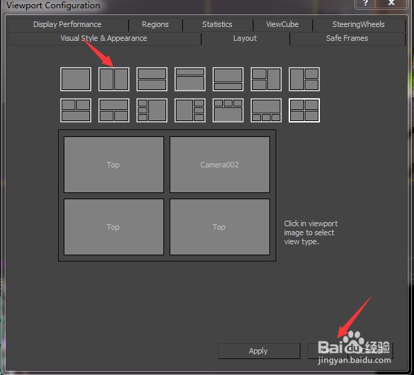 一:首先打開做好的室內場景。這里我的場景是調好材質的,打開場景,默認的是四個窗口顯示,如果說電腦配置不是很好或者是場景很大的話四個窗口一起顯示是很卡的,這時候我們需要右擊最右下角的工具區,彈出一個視口設置框,選擇兩個窗口顯示的按鈕ok。
