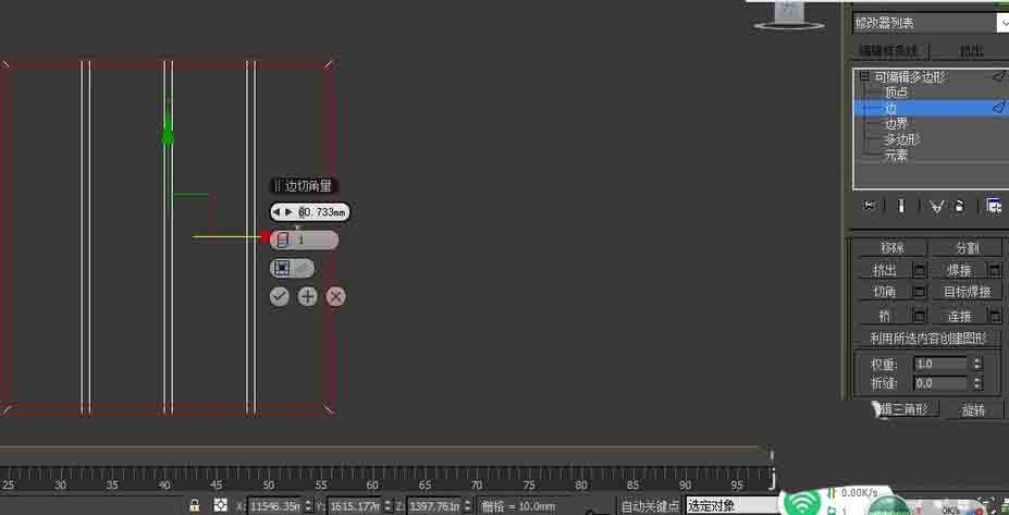 5、選擇中間的三條邊,然后選擇切角修改器。且切角量為30毫米。