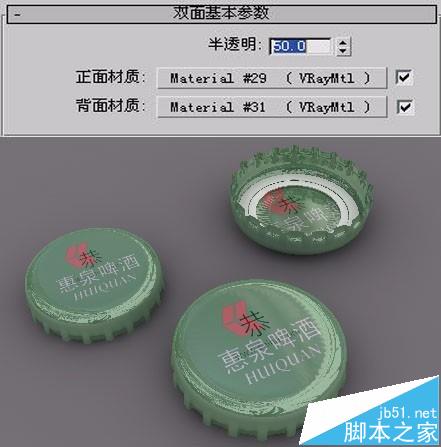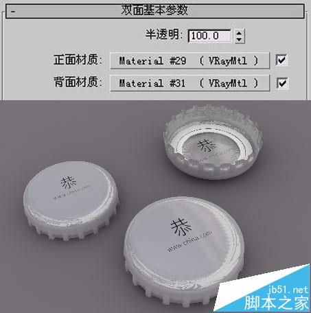 分析這個渲染結果,我們發現兩個正面瓶蓋的結果是正確的,但是反面瓶蓋的結果不正確,它仍然顯示正面效果。此時我們將總材質級別中的“半透明”選項設為50,再進行一次渲染。