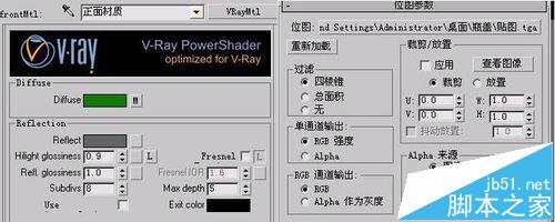 錯用max自帶雙面材質 (2)單擊進入“正面材質”,按照剛才我們的分析,我們將正面材質類型改為vraymtl基礎材質,設置漫反射為綠色,并且在其通道中貼入正面貼圖,注意啟用tga 貼圖的alpha通道以使文字產生漏空。