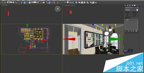4、將場(chǎng)景切換為頂視窗與攝像機(jī)視窗,在頂視窗中移動(dòng)相機(jī)位置,盡量在需要看到的360°場(chǎng)景的中央,并移動(dòng)攝像機(jī)目標(biāo)點(diǎn)對(duì)其進(jìn)行360°移動(dòng)觀看場(chǎng)景,做出調(diào)整爭(zhēng)取能看到最好的位置。
