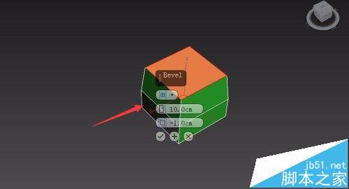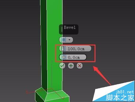 10、繼續(xù)選擇上面的這個面,再次找到bevel命令并點擊后面的按鈕,在彈出的設置對話框里設置高度為100,輪廓為0,點擊對號確定,如圖所示: