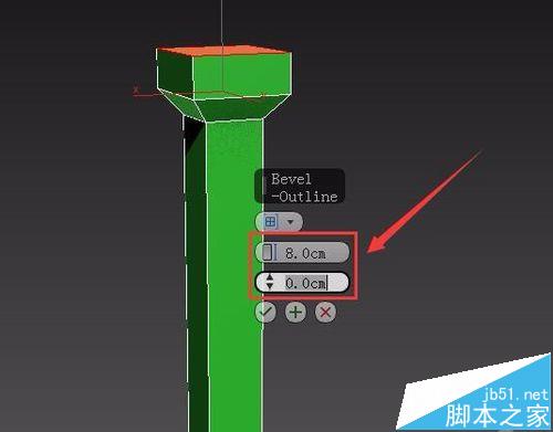 12、再次選擇bevel,并點擊其后的按鈕,設置高度為8,輪廓為0,點擊對號確定,如圖所示: