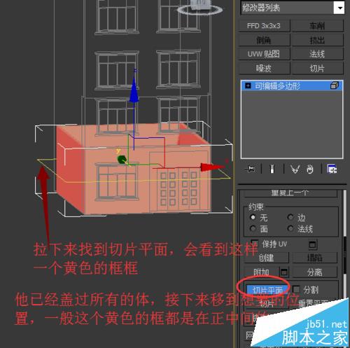 2、選擇想編輯的面或多邊形,點(diǎn)擊切片平面,(如圖),會(huì)出現(xiàn)一個(gè)切片平面,可用旋轉(zhuǎn)命令將黃色的切片平面旋轉(zhuǎn)到想要的位置,切片平面作用就像一把刀