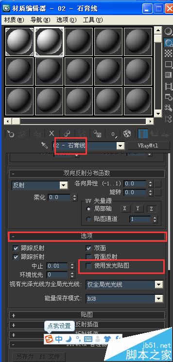 3、好了,下面就開(kāi)始亮大招了!按M把材質(zhì)編輯器打開(kāi)→調(diào)整石膏線(xiàn)的材質(zhì)→展開(kāi)選項(xiàng)→將使用發(fā)光貼圖的小勾勾去掉,如果是草圖的話(huà)燈光緩存的細(xì)分值再大一點(diǎn),不論小圖大圖細(xì)分在500以上基本就ok了! 什么你不相信?那就看看效果吧!
