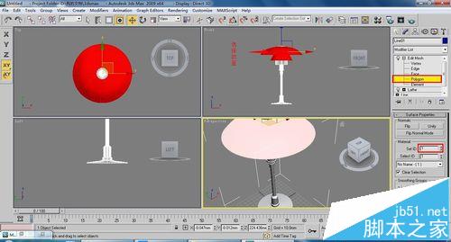 4、為臺(tái)燈添加一個(gè)【Edit Mesh】(編輯網(wǎng)格)命令,激活(多邊形)按鈕,在前視圖中選擇為燈罩的面,然后在【Set ID】(設(shè)置ID)右側(cè)的數(shù)值框中輸入I,按下Enter鍵,效果如下圖。