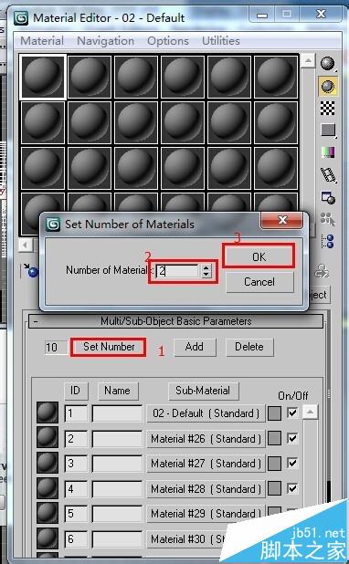 2、此時(shí)的面板就是【Multi/Sub-Object】(多維/子對(duì)象)材質(zhì)了,默認(rèn)是10種材質(zhì),單擊【Set Number】(設(shè)置數(shù)目)按鈕,在彈出的【Set Mumber of Materials】(設(shè)置材質(zhì)數(shù)量)對(duì)話框中設(shè)置樹(shù)目為2,單擊【OK】,在單擊【01-Default (Standard)】按鈕,在標(biāo)準(zhǔn)材質(zhì)界面中設(shè)置顏色為白色,如下圖所示。