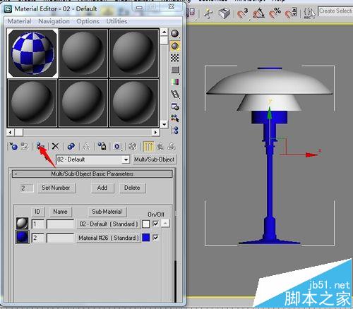 5、按下Ctrl+I鍵,進(jìn)行反選,在【Set ID】(設(shè)置ID)右側(cè)數(shù)值框中輸入2,按下Enter鍵,單擊(多邊形)按鈕退出,將調(diào)制的材質(zhì)賦予臺(tái)燈,效果如下圖。