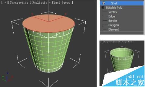 3、分離垃圾桶身部分,選擇頂上的面,按Delete鍵刪除。在修改器列表中選擇【殼】命令,給它一個厚度,設置參數外部量為3mm。這部分我們已經完成。