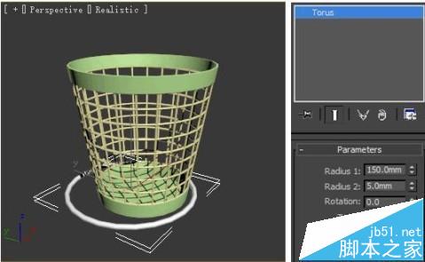 5、制作鏤空效果,垃圾桶大致做好了,我們在頂上加個圈當成固定垃圾袋的扣。在【創建面板】-【幾何體】-【標準基本體】中選擇圓環,在頂視圖畫出一個圓環,修改參數如圖。