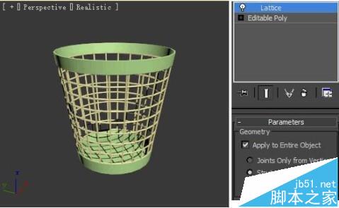 4、制作垃圾桶除鏤空部分外,選擇被分離的部分,在修改器列表選擇【晶格】,在參數中勾選【僅來自邊的支柱】,支柱的半徑設為3mm。這時就會出現鏤空的效果。更改顏色,使兩者更好區別。