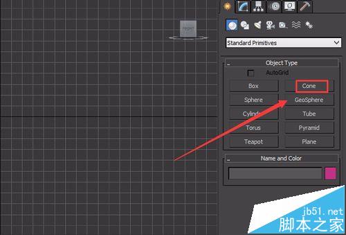 3、點擊cone命令,在頂視圖創(chuàng)建一個cone物體,如圖所示: