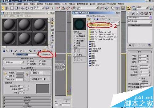 5、選擇“mentel ray”渲染器,單擊“確定”,然后打開材質編輯器,選擇一個材質球,單擊“標準”按鈕,選擇“glass” ,如圖