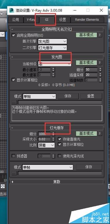 3、在這里,VR里的GI非常重要,發光圖測試要調低。燈光緩存要調低,相當影響渲染速度 。