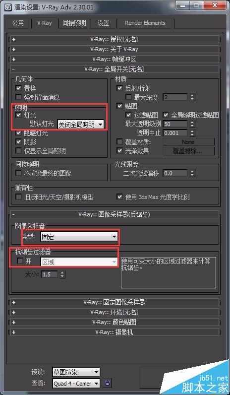 2、然后,vray——全局開關——關閉全局照明 ,圖像采樣器——類型——固定——關閉抗鋸齒過濾,如下圖