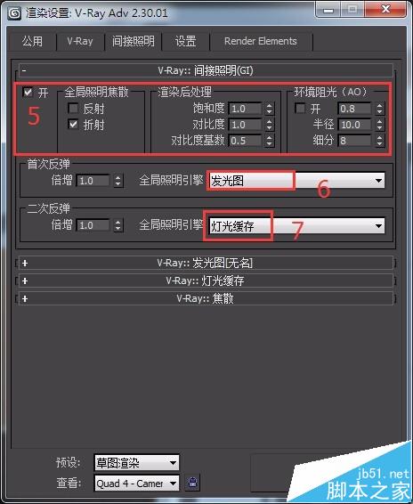 4、下面,間接照明——打開間接照明——在一次反彈里面選擇“發光圖”——在二次反彈里面選擇“燈光緩存”。