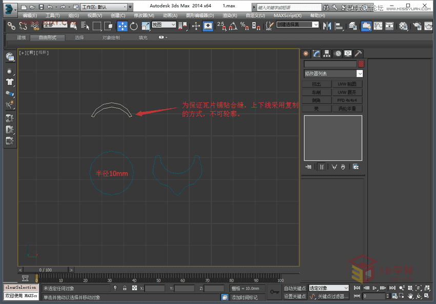 11,孤立其中一個瓦片組,進入左視圖,在實體顯示狀態沿模型上沿描線,首位要長一點,根據亭子結構定。