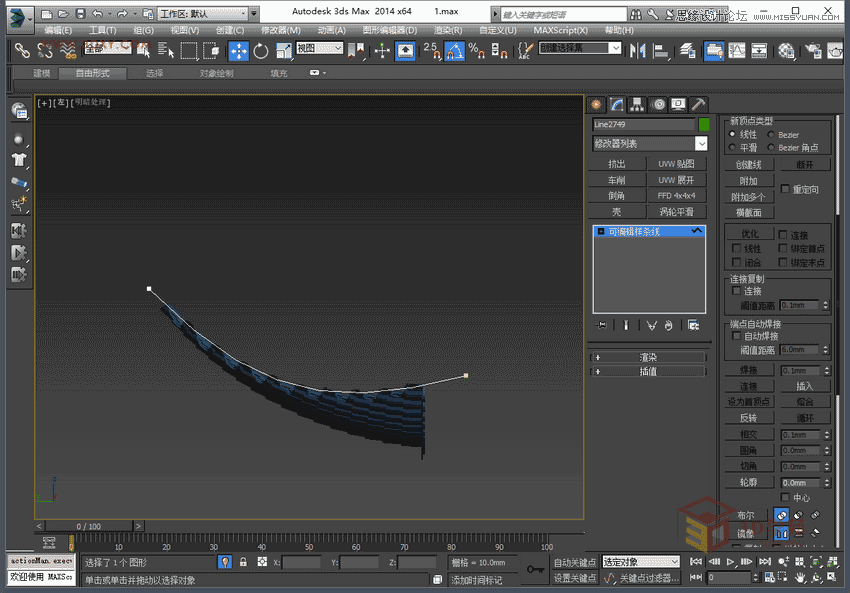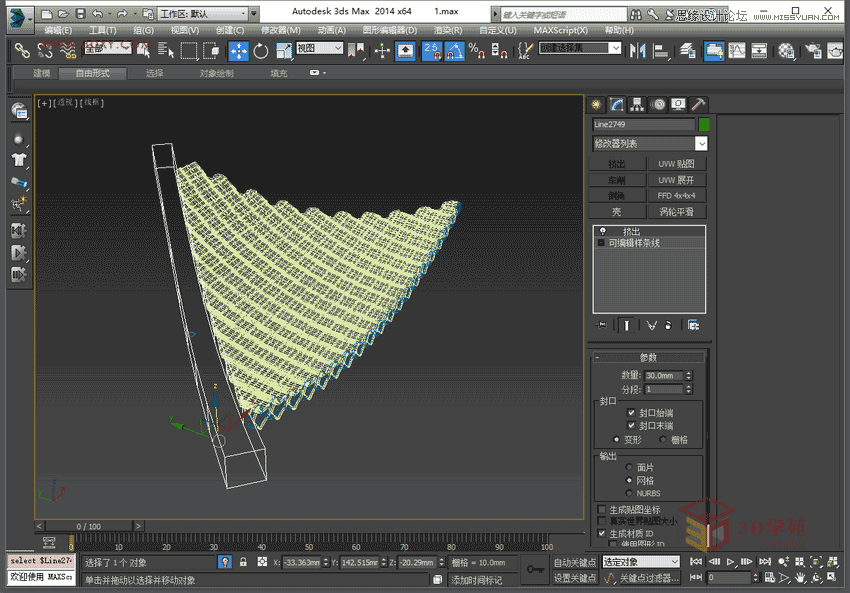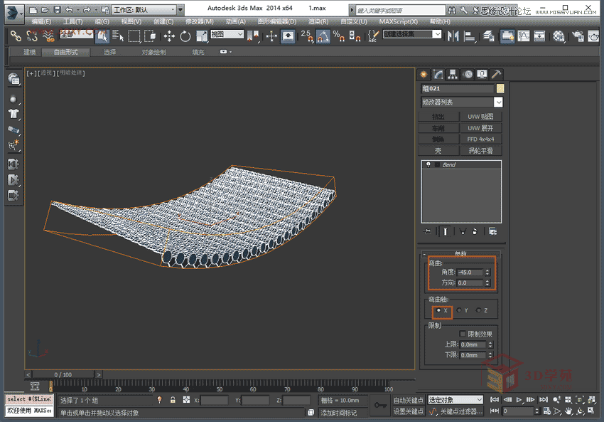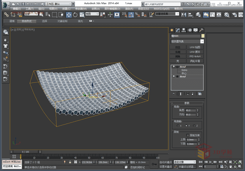 5,將做好的物體成組,給一個bend彎曲命令,參數如圖。