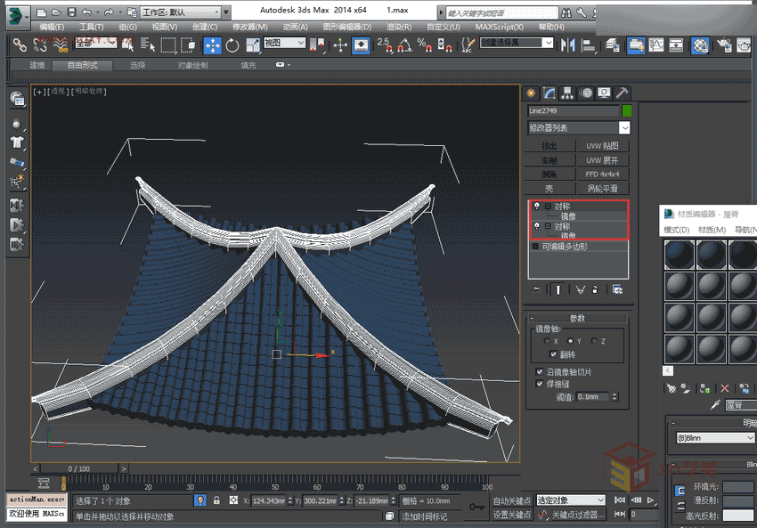 15,在頂視圖選擇做好的屋脊加兩次對稱命令,注意分別調整其對稱點,必須在之前設定的亭子中心位置。