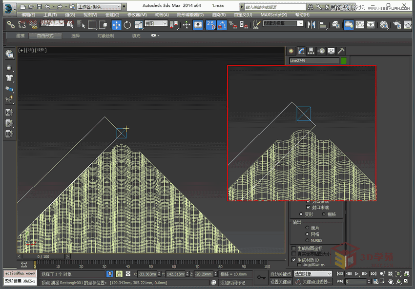 12,將繪制的樣條線進行輪廓20mm,擠出30mm,即為亭子的屋脊,厚度根據實際情況定。