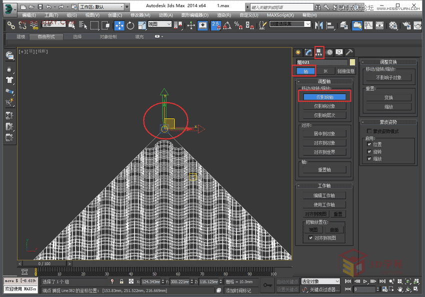 9,將接好的線挪回原地,齊交點就是我們亭子的中心點,進入層面板,點擊影響軸,把屋頂的軸心捕捉在設定好的點上。