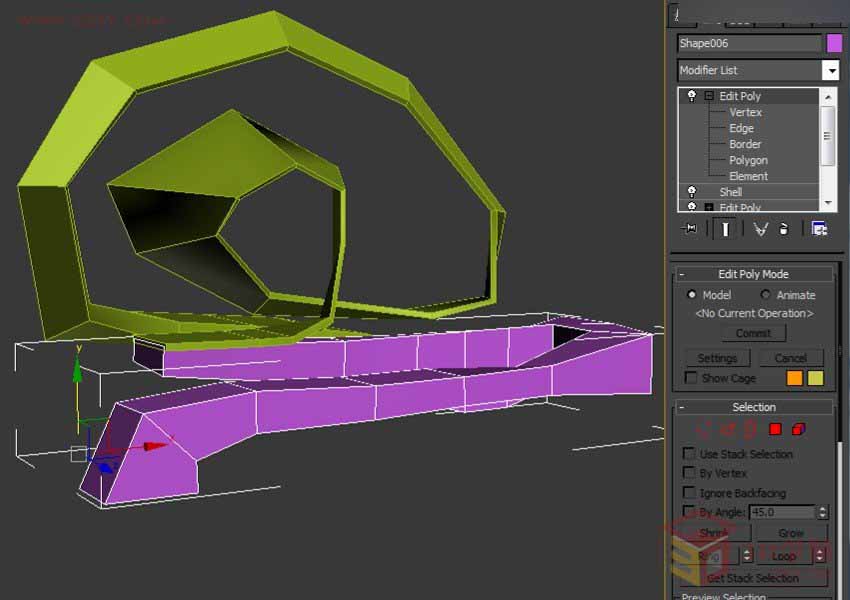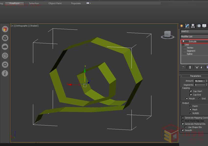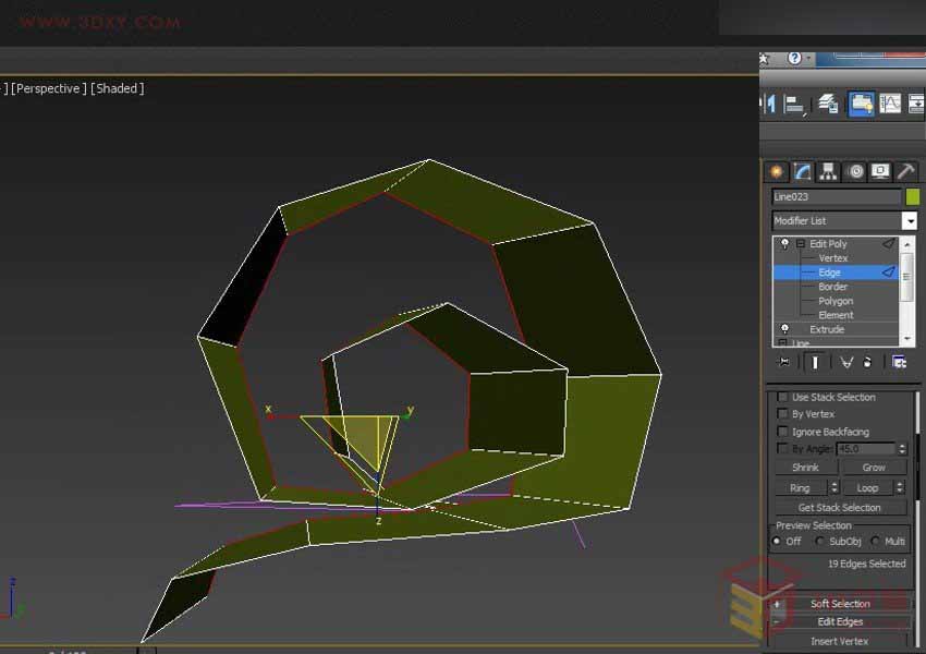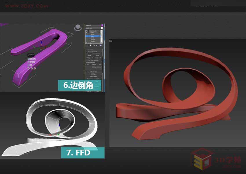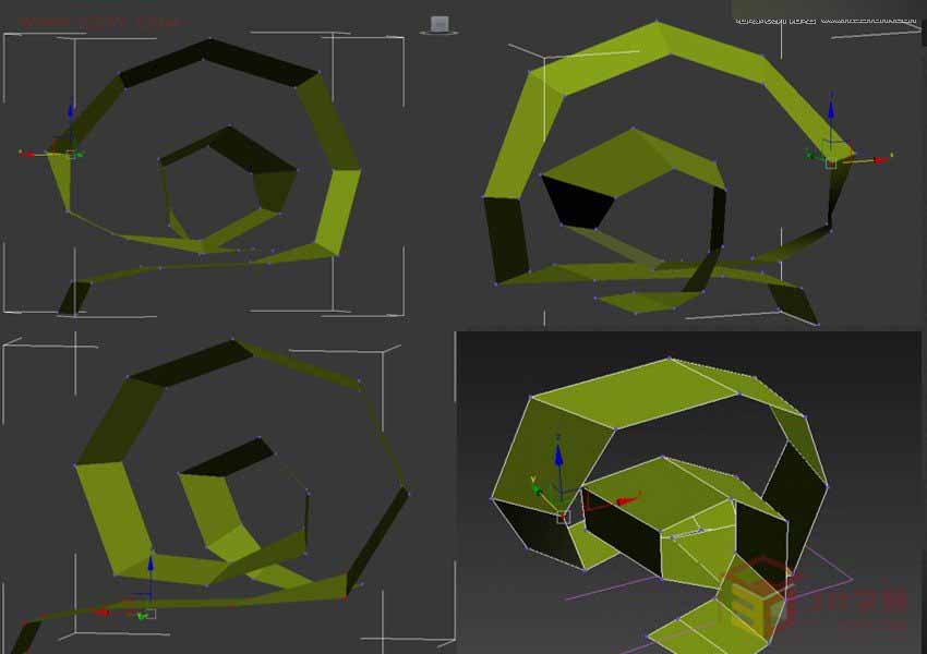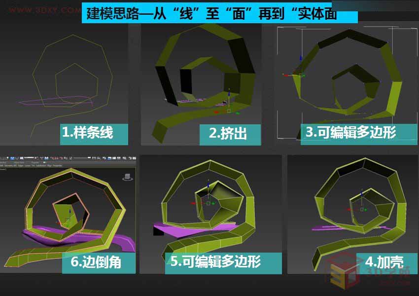 那么今天我們的建模思路就是建模思路—從“線”至“面”再到“實體面”:樣條線→擠出→可編輯多邊形→加殼→可編輯多邊形→邊倒角→FFD工具。