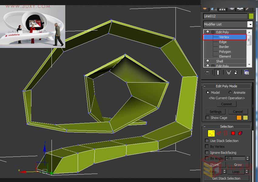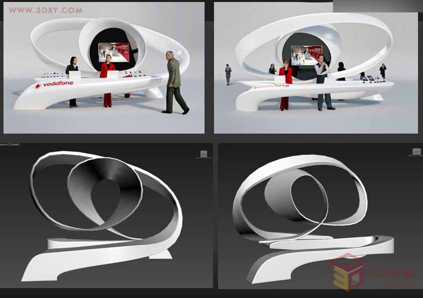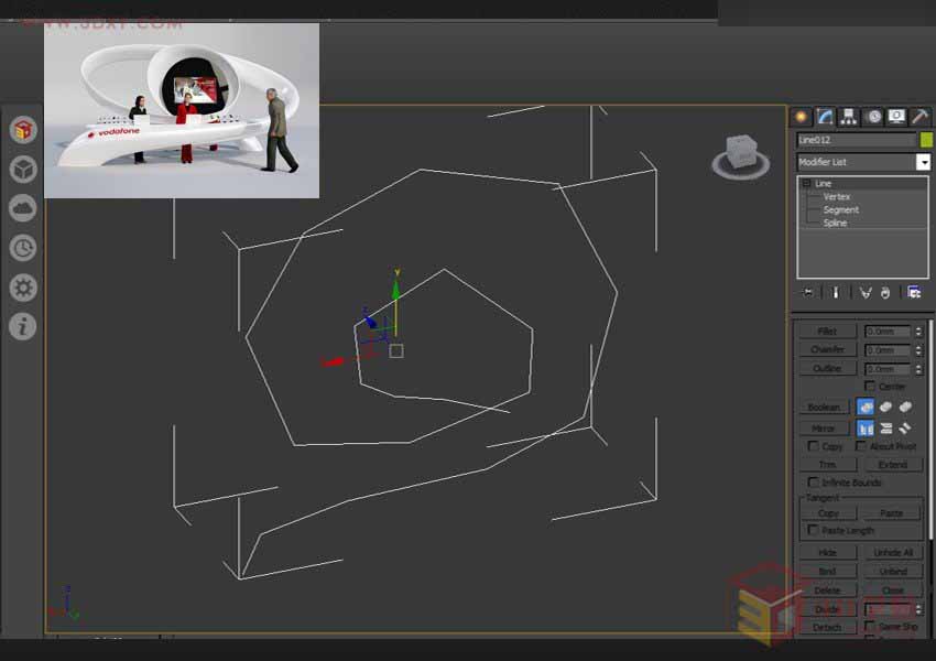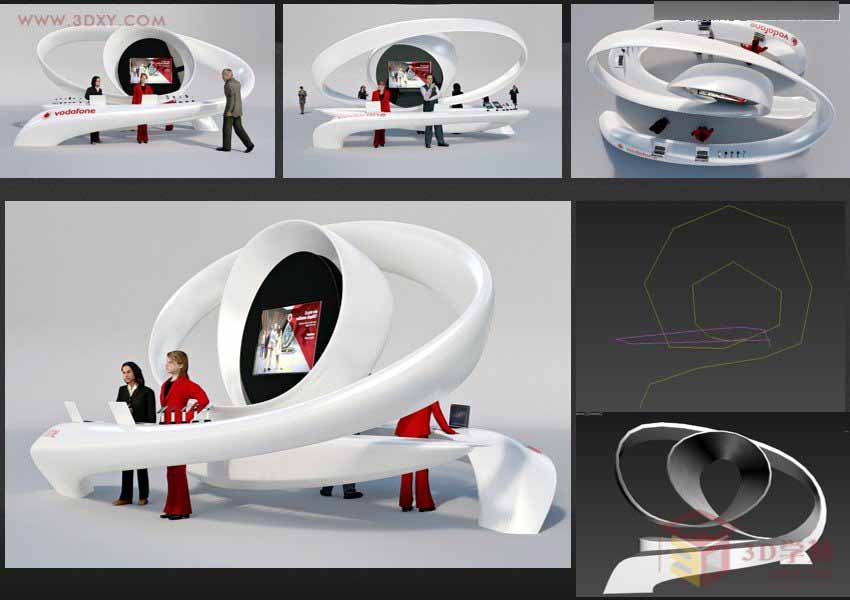 具體的建模操作步驟:經過分析發現,這個展臺造型可以通過拆分的形式將前臺和后面的結構進行分解,所以首先從樣條線開始,畫出前面的螺旋形式造型和后面的接待造型。