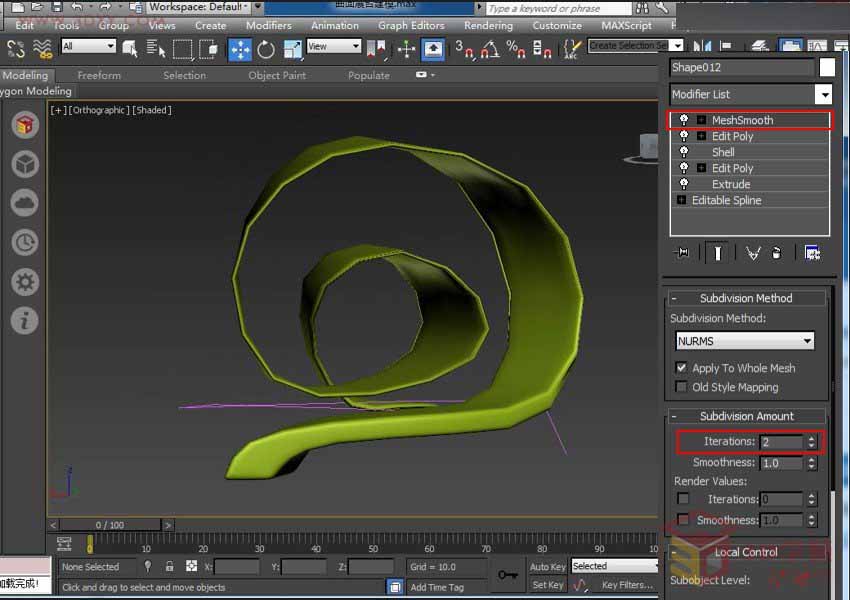 添加網格平滑(meshsmooth),給出平滑值為2,大致的造型就出現了,我們先放在這里,細節還得后期調整一下。