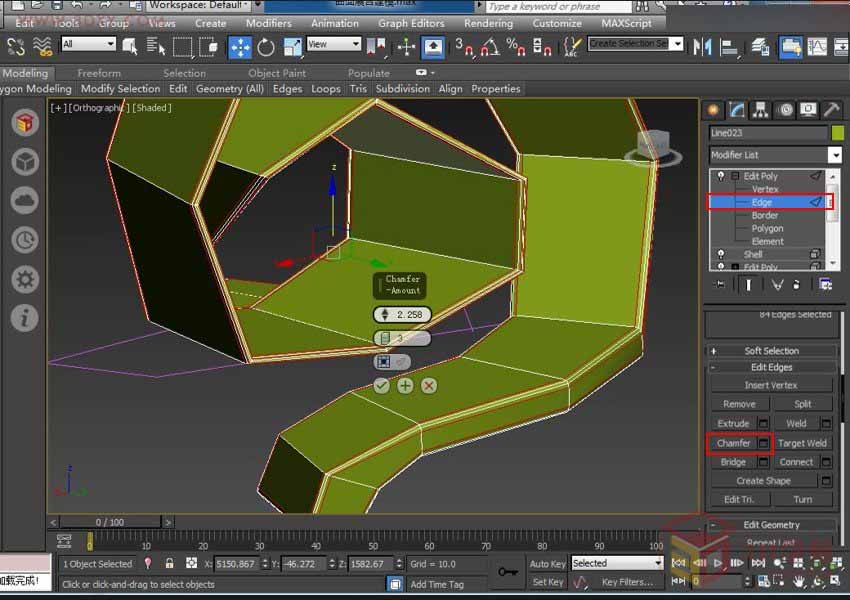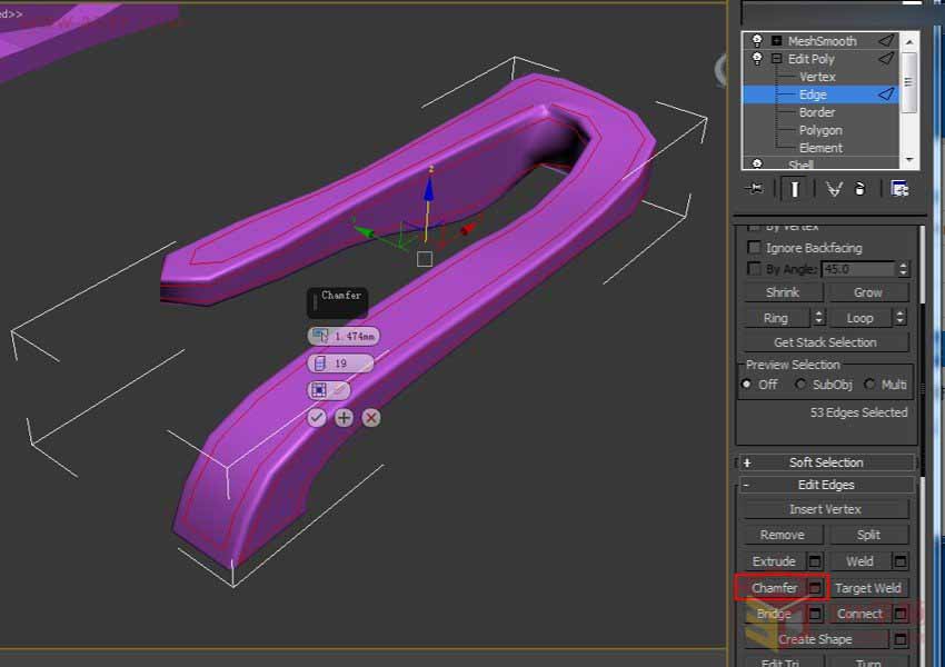 對選中的邊進行角邊(chamfer),注意切角量參數,分段數稍微給多一點。