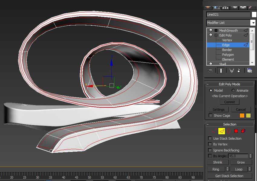 這里的線主要是二維樣線條,由樣線條擠出生成面,對面轉化為可編輯多邊形后,加殼命令,成為實體面后再次進行可編輯多邊形,這種建模方式適用面挺廣的,大家看看通過這種建模方式制作出來的U形連續結構的展臺,由上下的矩形二維線,以底部的二維線作為參考,頂部的二維線進行進行移動操作,擠出后將頂部的線進行對齊操作,連接線的形式把紅色的白色的地方進行區分,區分后我們對提取出來的面進行添加殼命令,并且還要注意前后關系。