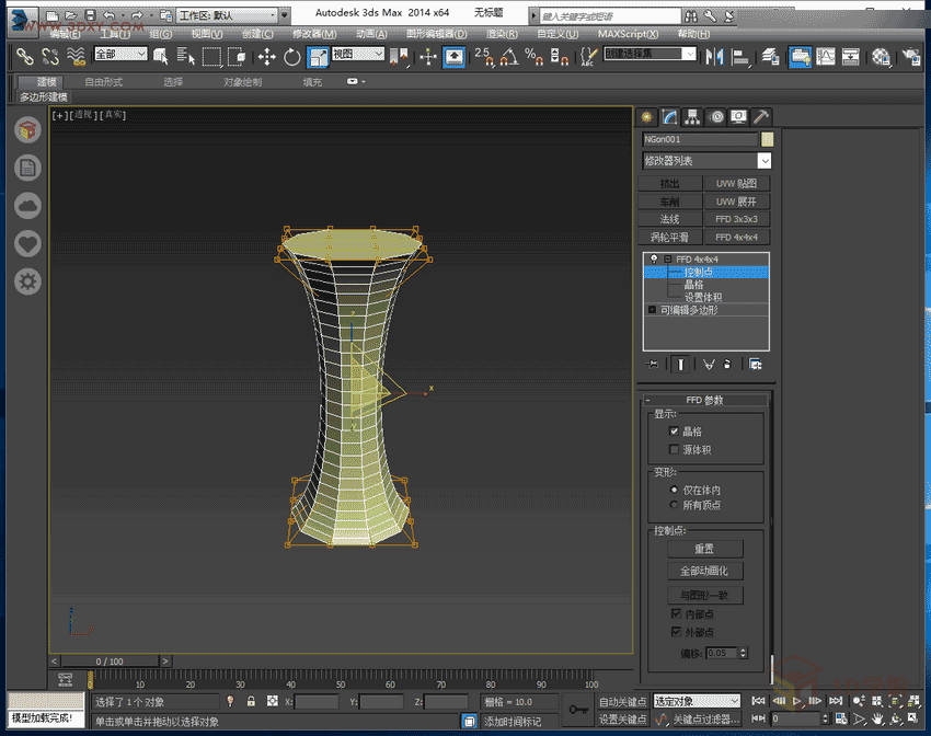 3,轉(zhuǎn)化為可編輯多邊形,加一個(gè)FFD4*4*4命令,進(jìn)入控制點(diǎn)層級(jí),調(diào)節(jié)花瓶的形狀。