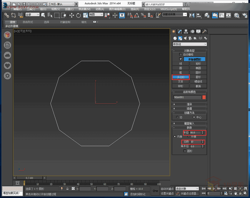 1,首先,在頂視圖建一個(gè)多邊形,半徑50mm,邊數(shù)10。