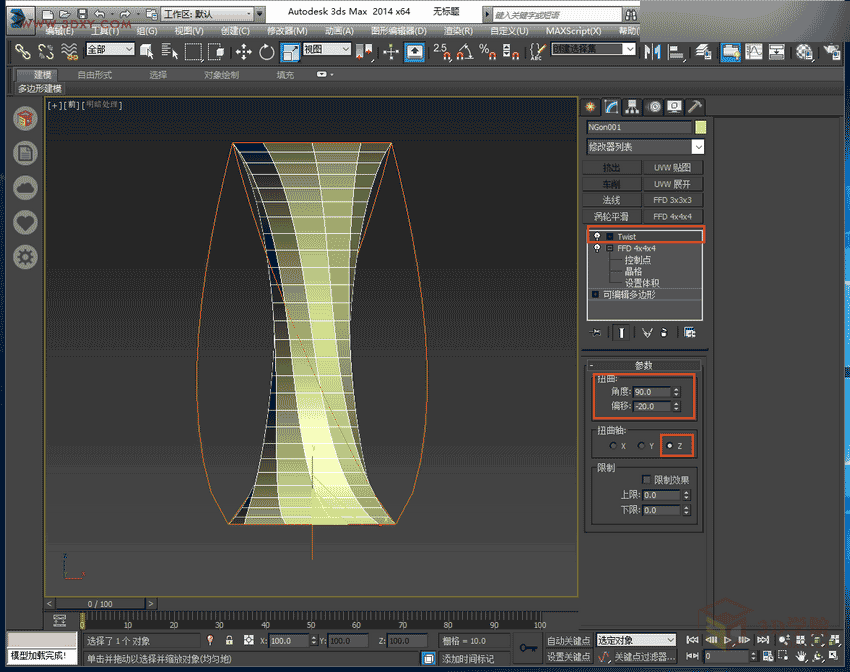 4,為模型添加一個(gè)扭曲命令,角度90,偏移-20,沿z軸方向。