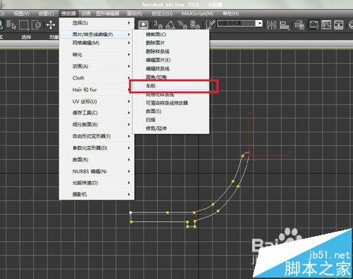2、我們需要將這個(gè)二維線條轉(zhuǎn)換成三維模型,那么,就需要使用車削命令了。車削說(shuō)簡(jiǎn)單點(diǎn)就是車刀在平面內(nèi)作直線或曲線移動(dòng)的切削加工。我們點(diǎn)擊菜單欄-修改器-面片/樣條線編輯-車削