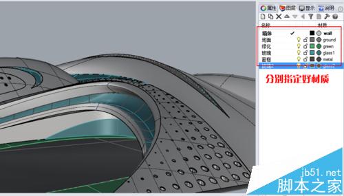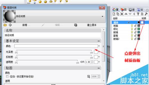 6、下面看如何解決,打開Rhino模型,在材質(zhì)面板中點(diǎn)擊墻體層后邊的材質(zhì)按鈕。