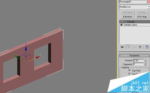 1、首先,畫房子的墻體與窗子,右側工具欄【Rectangle】,如圖,畫好后,點選其中一個物體,右擊點擊右下角編輯為【Editable spline】線,修改欄Attach將門窗合并為一個物體,擠出厚度【Extrude】為0.3m,M調出材質面板附材質,