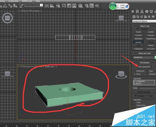 3、選擇boolean之后,我們看到有個pick operandB 這個就是拾取運算的對象,我們選擇圓柱體,如圖所示,我沒看他們的交合部分就流出來了,
