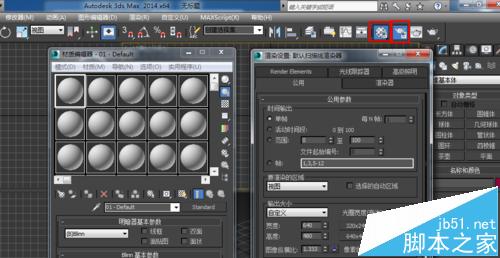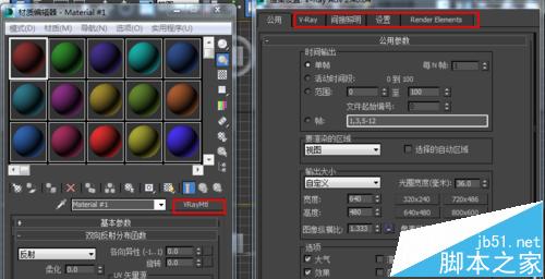 8、啟動max后,我們打開材質(zhì)編輯器和渲染設(shè)置面板,這時候會看到一個各種顏色的材質(zhì)球,那就是vray的默認材質(zhì)顯示,在渲染器設(shè)置上也是將指定渲染器改為了vray渲染器。