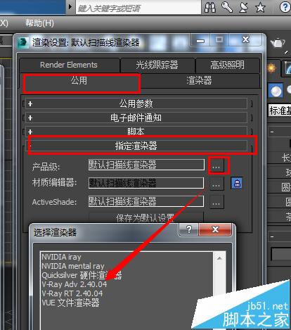 4、如果使用vray材質(zhì),那么必須安裝vr渲染器,然后在渲染設(shè)置面板將指定渲染器設(shè)置為vray渲染器,材質(zhì)上才會有vray專業(yè)材質(zhì),這是手動指定。