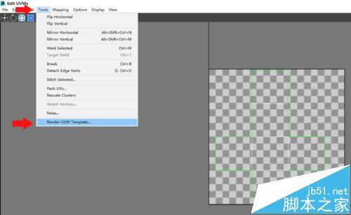 13、如圖點擊 "Tools", 在下拉菜單中找到 "Render UVW..."(最后一個)的選項,點擊它