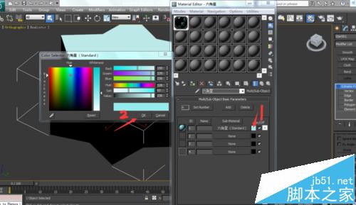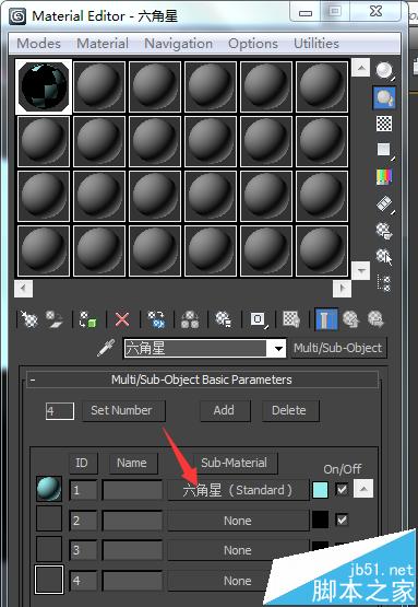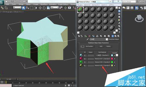 8、設置完成后,四種顏色的六角星就出來了,當然你可以設置更多種顏色。這時候可以看到材質球和一般標準的材質球不一樣,這就是多維子材質的運用。