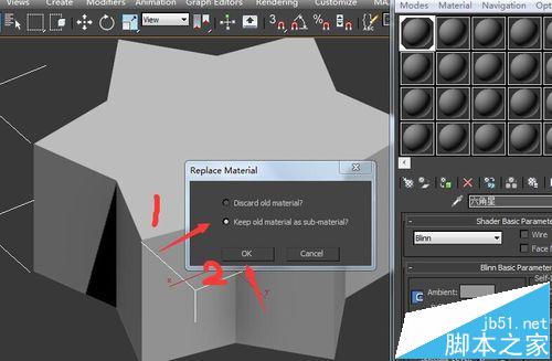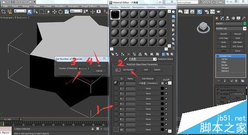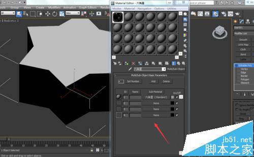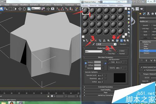 4、將所有的面按自己的想法都設置好id號后,打開材質編輯器,隨意選擇一材質球,按自己想法命名為六角星,記得一定要養成先給材質球命名的好習慣,將材質球賦予場景中物體顯示出來,默認的材質顏色是灰色。