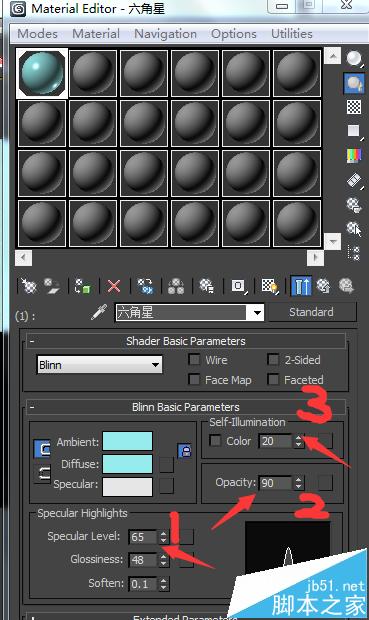 7、在每一個id號的顏色框將顏色設置為自己想要的顏色,并點擊中間材質通道進入標準材質,更改材質的反射高光光,根據自己需要調節不透明度與自發光。其他幾個id號也是同樣的操作。在單個id材質通道中根據自己的需要還可以嵌套其他材質。
