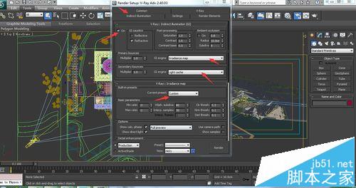 8、找到Indirect illumination下的GI打開,將下面的首次反彈Primary bounces和二次反彈Sencondary bounces下的GI image分別改為擦補貼圖Irradiance map和燈光緩存light cache。并將Irradiance map中的current preset改為較高的值(-3,-1)和細分(80,30)。