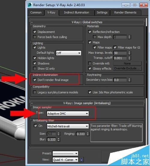 4、打開VR面板,抗鋸齒改成“DMC”,這一步是為了等會跑完光子后不用在操作這一步了,然后在“don't render final image"前面的對勾打上,原因是跑光子不用出圖