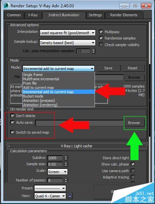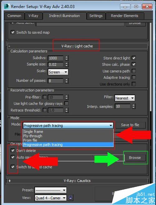 7、在”mode“選項里,選擇中間最長的那個(這是最好記的辦法),然后下面”on render end“選項里,三個選項全部打鉤,意思是自動儲存光子和讀取光子,然后點擊后面的”Browse“,給光子設置存儲路徑.