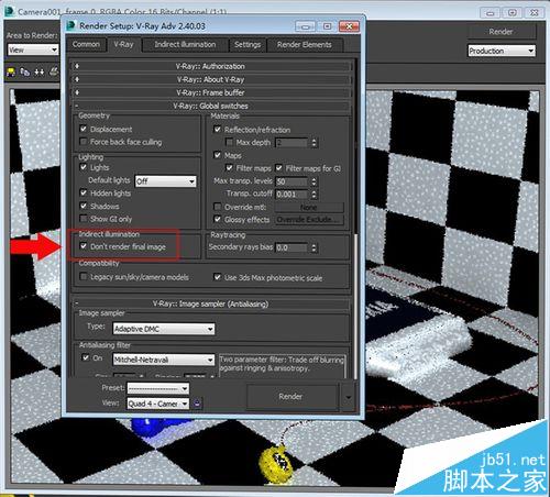 12、光子渲出來后,把VR面板里的“don't render final image"前面的對勾去掉,意思是接下來渲染成圖要出圖