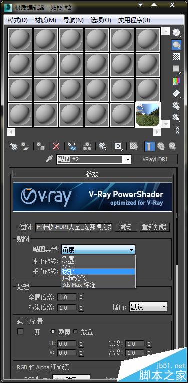 4、打開復制的材質,在瀏覽里打開電腦文件夾,找到需要的HDRI貼圖,需要先下載好。貼圖類型改為球體
